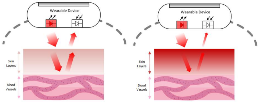 1. 若使用者的肤色较黑,那么反射回的光信号会较微弱;