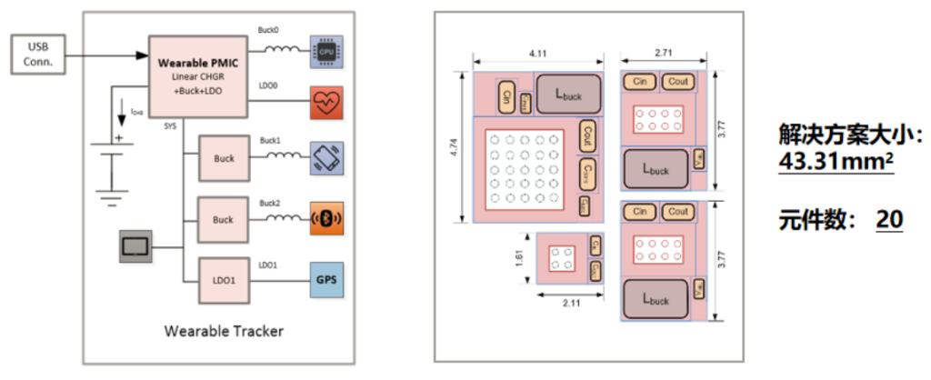 典型的可穿戴系统就像一个功能的综合体:除了集成上述讨论的 AI 处理器、传感器、GPS、音频模块,也可能会集成振动、蜂鸣器或蓝牙等越来越多的功能。据估计,实现这些功能的解决方案的尺寸会达到约 43mm2,总共需要 20 个器件。