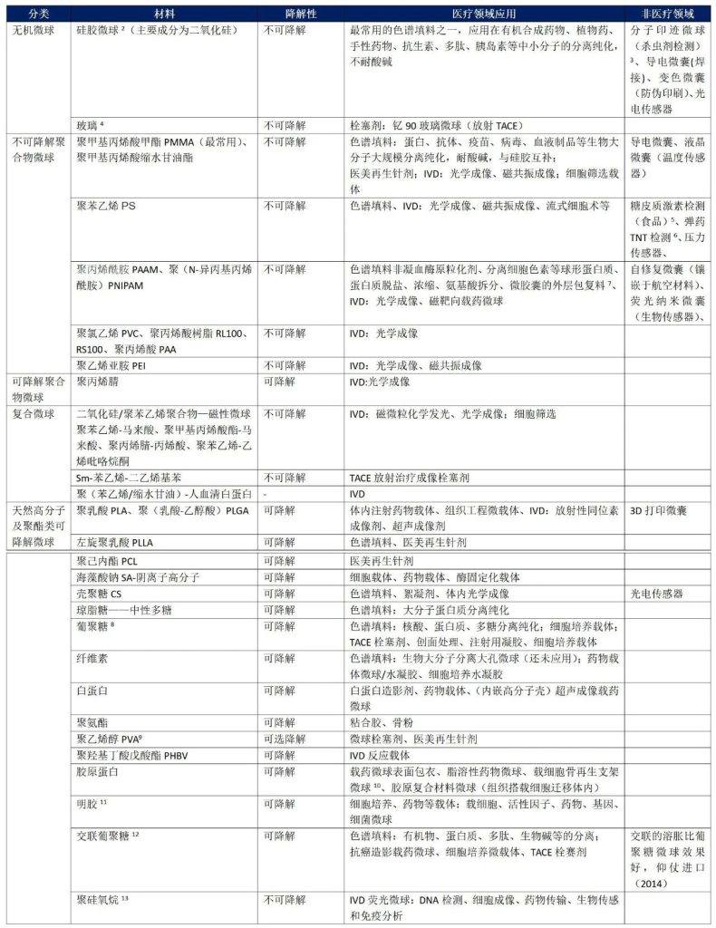 微球分为四类,分别是:1)以硅胶微球为代表的无机物微球;2)以聚苯乙烯、聚丙烯酸酯、聚甲基丙烯酸甲酯、聚丙烯酰胺等为代表的不可降解聚合物微球及少量可降解聚合物微球;3)以聚苯乙烯/二氧化硅磁性微球代表的有机-无机复合微球;4)以高分子原料制备的琼脂糖、壳聚糖、白蛋白等天然高分子微球或聚乳酸、PLGA、聚己内酯等聚酯类生物可降解高分子微球。以下为四类微球的主要应用场景(PDF版内容可点击文末阅读原文):