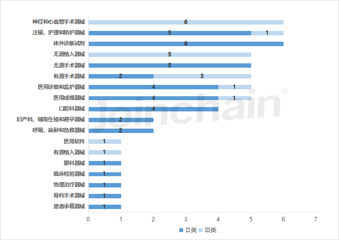 从细分领域看,细分为18个产品大类,其中神经和心血管手术器械数量居首,进入创新审批通道共6件,另外体外诊断试剂、无源植入器械、医用成像器械、有源手术器械、注输、护理和防护器械产品数量相对领先。