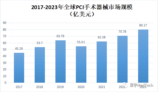冠心病是我国常见的心血管疾病之一,PCI手术是目前主流的治疗手段。2022年,中国冠心病患者超过1100万人,实施的PCI手术接近130万例。随着人口老龄化进程加快,PCI手术量将以超10%的增长率快速增长。全球PCI手术器械市场规模整体呈增长趋势,2020年出现下降,2021年恢复增长。2021年市场规模达62.28亿美元,同比增长13.22%,预计2023年将达80.17亿美元。