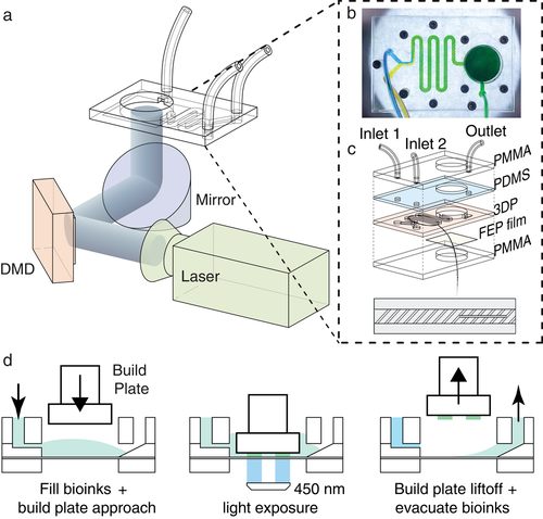 主要内容:复杂组织的再现意味着一个巨大的挑战,迄今为止,只有少数方法可以有效地重建3D结构中必要的梯度。本文开发了一种基于可组合梯度数字光处理的打印系统,利用微流体混合器的前所未有的集成来实时生成所需生物墨水的连续或离散梯度。通过调整生物墨水流量比率,可以轻松地即时组合精确控制的梯度。作者展示了在水平和/或垂直方向上表现出材料、细胞密度、生长因子浓度、水凝胶刚度以及孔隙率的连续梯度的各种平面和3D结构。