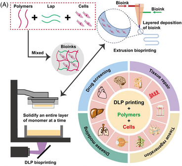 主要内容:3D生物打印能精确制造各种3D高分辨率物体,广泛用于创建模拟人体微生理环境的3D组织模型。其中,DLP 3D打印技术可设计和开发复杂的组织支架,将各种干细胞封装到具有不同硬度的材料中。本文对DLP生物打印进行了简要介绍,并进一步讨论了具有各种生物墨水的 DLP(生物)打印机的设计和制造及其在药物筛选、疾病建模、组织修复和再生医学方面的生物医学应用。最后,详细介绍了DLP打印平台的优势、挑战和前景。