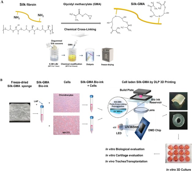 主要内容:使用数字照明处理(DLP)打印机进行3D打印已成为再生医学组织工程的新浪潮,特别是对于临床应用。该研究利用缩水甘油基甲基丙烯酸酯(Silk-GMA)制造用于DLP 3D打印。体外培养系统评估了含有软骨细胞的Silk-GMA的软骨形成能力并在体内应用。长达4周的Silk-GMA水凝胶体外培养可以确保细胞的活力,增殖和分化为软骨形成。动物实验表明移植的Silk-GMA水凝胶周围发现了新的软骨样组织和上皮。