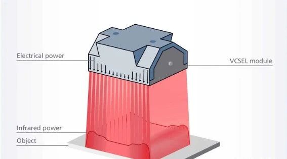 数千个微型激光器(VCSEL)被安装在了单块芯片上。每个发射器上均装有 56 块这样的芯片,而 一个模块则由若干个发射器构成。矩形辐射区可包含数百万个微型激光器并且可输出数千瓦的红外激光功率。