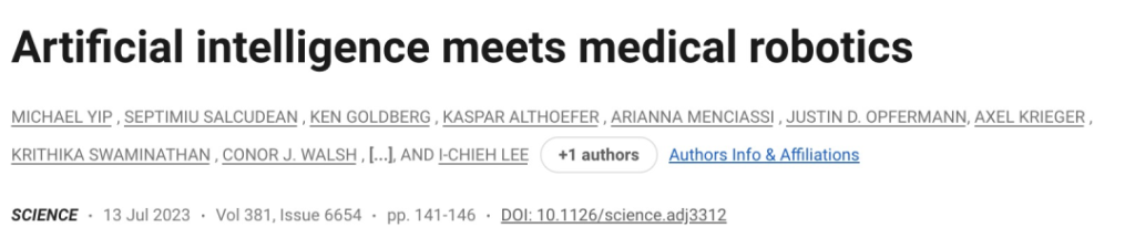 今天为大家介绍的是来自多位作者合著的一篇关于医疗机器人展望的论文。人工智能(AI)在医疗机器人中的应用为医学带来了一个新时代。先进的医疗机器人可以进行诊断和手术程序,辅助康复,并提供共生义肢来替代肢体。这些设备使用的技术包括计算机视觉、医学图像分析、触觉反馈、导航、精确操控和机器学习(ML),可以使自主机器人进行诊断成像、远程手术、手术子任务,甚至整个手术过程。此外,康复设备和先进义肢中的人工智能可以提供个性化支持,以及改善功能和移动性。机器人技术、医学、材料科学和计算能力的巨大进展相结合,有望在未来带来更安全、更高效、更广泛可用的患者护理。