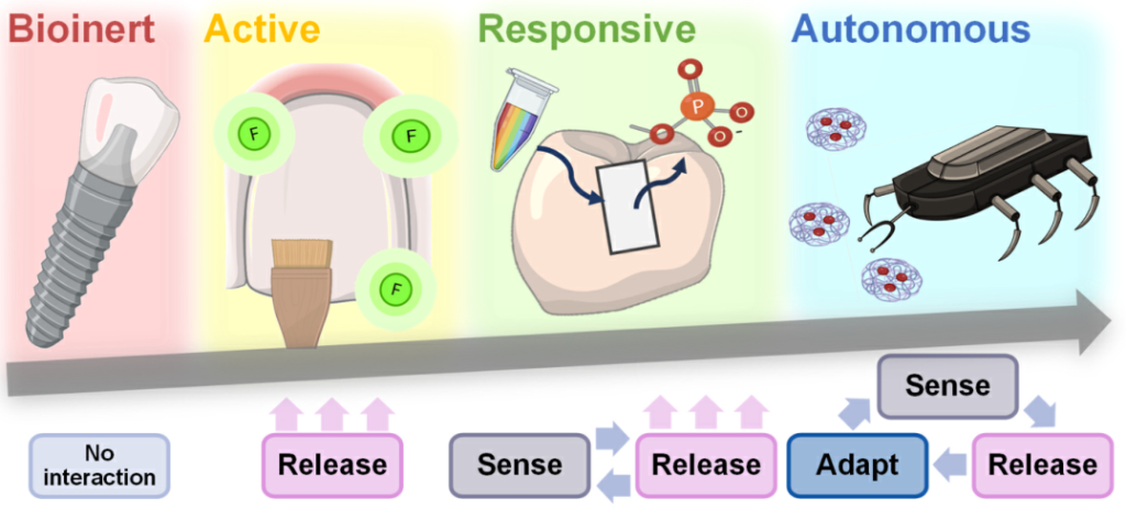 生物惰性生物材料与周围组织的相互作用最小,植入后对周围组织的伤害或毒性最小。例如,聚醚醚酮(PEEK)是一种安全、化学惰性的生物材料,用于口腔植入物、牙冠、牙桥、内支架和义齿框架制作。其他生物惰性牙科材料包括不锈钢、钛和聚甲基丙烯酸甲酯(PMMA)。生物活性材料在植入或接触组织、细胞或体液后,在材料-组织界面诱导特定的生物反应。在这种情况下,生物活性指的是提供有益治疗的材料(例如抗菌、再生、药物递送),而不是仅提供再矿化的生物材料。这些生物材料安装在体内后“不受控制”地释放治疗。例如,释放氟化物的化合物可以稳定牙齿的循环脱矿和再矿化过程。当唾液pH值小于5时,氟离子取代牙齿羟基磷灰石中的OH离子,导致氟磷灰石(FA)或氟羟基磷灰石(FHA)的形成,这些化合物更能抵抗pH值的变化,从而抵抗脱矿。此外,氟化物通过抑制细菌生长并干扰其嗜酸性、耐酸性和对牙齿表面的粘附,对细菌细胞具有毒性。