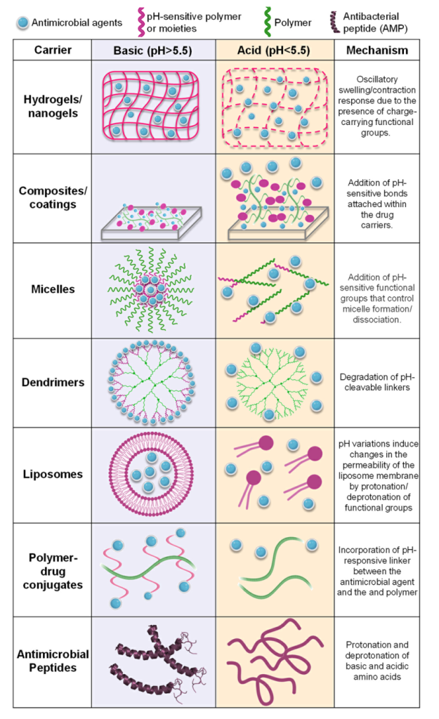 Fig. 3. Configurations used as pH-responsive carriers for the delivery of oral antimicrobial therapies. After degradation/cleavage of the pH-sensitive bonds/ compounds, the carriers release their payloads, which can be in the form of antimicrobial compounds, nano-fillers, or antimicrobial peptides.