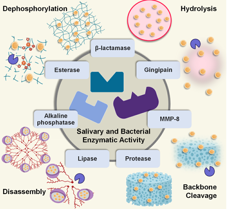 酶响应:酶是加速生物化学反应的催化剂。细菌和真菌分泌各种酶,包括脂肪酶、酯酶、磷酸酶、脲酶、明胶酶等。其中一些酶已被确定为指示疾病活动期的标志物,即需要治疗的时候。例如,慢性牙周炎的细菌副产物是基质金属蛋白酶-8(MMP-8),它会触发宿主免疫反应。这种酶已被用作治疗牙周炎的生物反应递送系统中的刺激物。