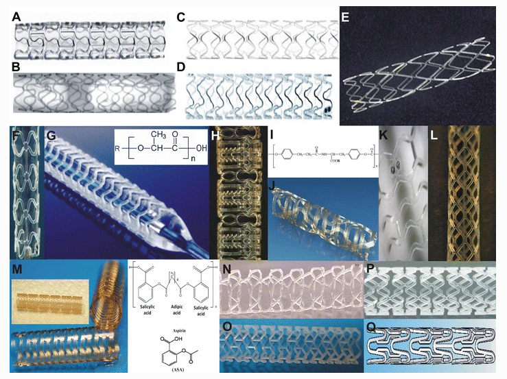 图1 2012年一篇综述中提到的,当时在研的可降解支架们。(A)AMS(Absorbable metallic stent) 1;(B)AMS 2;(C)DREAMS 1;(D)DREAMS 2;(E)Igaki-Tamai支架;(F)Vascular BRS 1.0;(G)Vascular BRS 1.1和PLLA的化学结构;(H)Reva Medical的BRS版本1;(I)Reva Medical BRS的分子组成和版本2;(K)DeSolve BRS;(L)ART BRS;(M)第一代和第二代IDEAL支架和所使用聚合物的化学结构;(N)Acute BRS;(O)Amaranth PLLA;(P)Xinsorb;(Q)Sahajanand BRS。大家可以看看十年后的现在还剩了几个