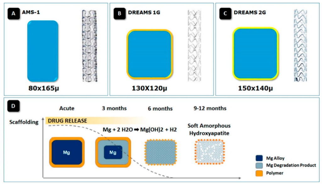 图2 (A)~(C)几款镁支架的横截面示意图;(D)药物洗脱可吸收镁支架的吸收过程示意图,抗增殖药物的释放在植入后的3月内,整个支架在9个月的随访期间逐渐吸收成软的无定形羟基磷灰石(amorphous hydroxyapatite)