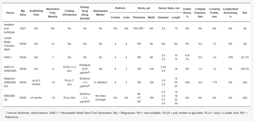 DREAMS 2G支架就做过BIOSOLVE-II、-III和-IV研究,Magnesium 2000上市后研究,Magmaris Multicenter Italian注册研究,等等。在第一个临床研究PROGRESS中,镁支架的安全性得到了验证,但是4月时临床驱动的靶病变血运重建率(CDTLR)很高(23.8%),并有0.83mm的节段内晚期管腔丢失(In-segment LLL),支架内再狭窄也被认为是支架失效和新生内膜增长所致。到了DREAMS 1G支架,虽然支架的机械性能得到了显著改善,并添加了紫杉醇药物,减少了1年CDTLR的发生,但其晚期管腔内丢失仍不理想(0.52mm),所以药还是得加。DREAMS 2G支架则不仅在骨架设计方面进行了改进,还引入了药物-聚合物涂层,西罗莫司与可生物吸收的聚-L-丙交酯酸聚合物(Bioresorbable poly-L-lactide acid polymer)相结合,延长了镁骨架支架的稳定性。