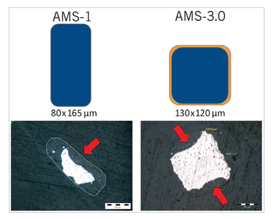 图6 AMS-1和AMS-3.0支架的小梁横截面示意图(上),以及植入猪冠脉动脉模型28天后的光学显微镜下外观(下)。注意一代和三代支架相比,结构由矩形改成了方形,其厚度从165um减少到了120um