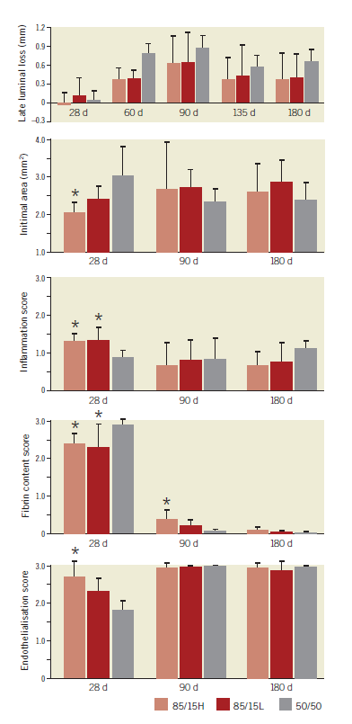 图8 三种不同设计的AMS-3.0支架猪模型中晚期管腔丢失、内膜面积、炎症评分、内膜纤维蛋白含量和内皮化评分的比较