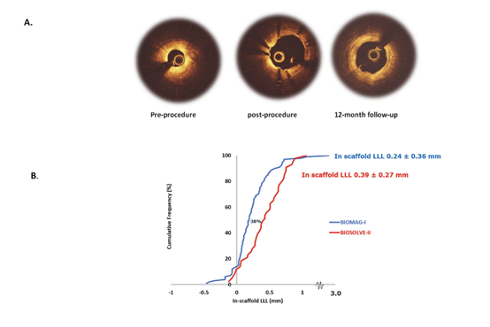 本次的BIOMAG-I是评估新一代DREAMS 3G支架的首个研究,此前瞻性、欧洲多中心、单臂的试验从2020年4月至2022年2月入选了116名患者,97.7%的支架成功释放。初步结果表明,第三代药物洗脱可吸收镁支架DREAMS 3G达到其设计目标,血管内成像显示其在6-12个月之间有良好的管腔保存。