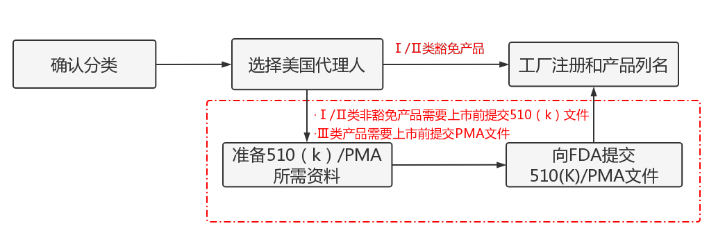 Ⅰ/Ⅱ类豁免产品直接进行工厂注册和产品列名,某些 Ⅰ类和大多数 Ⅱ类设备需要准备 510(k)资料,Ⅲ类设备需要准备PMA资料。