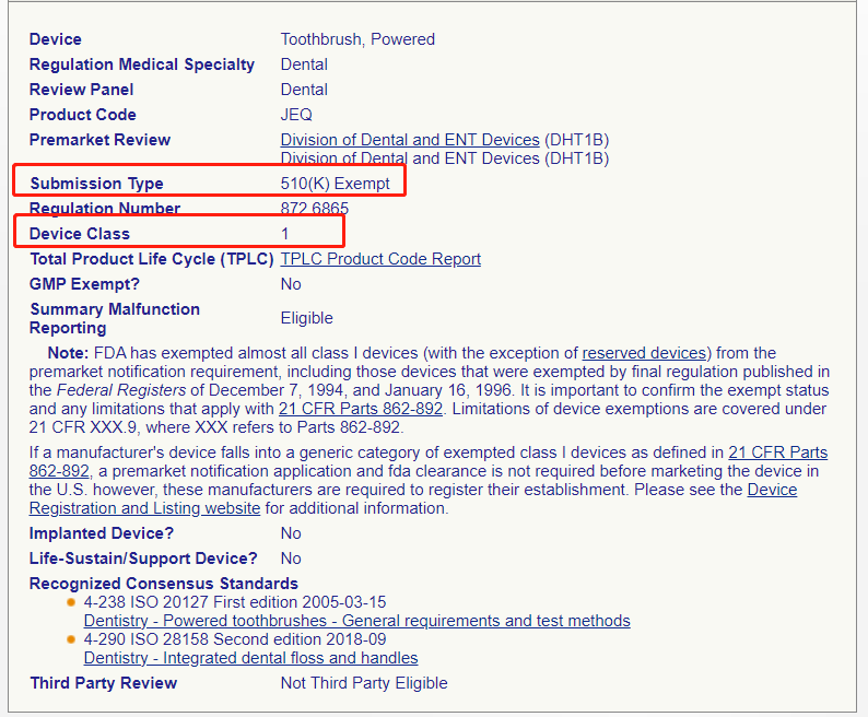 ▶ 查看产品分类信息,电动牙刷属于Ⅰ类医疗器械,且豁免于510(k)