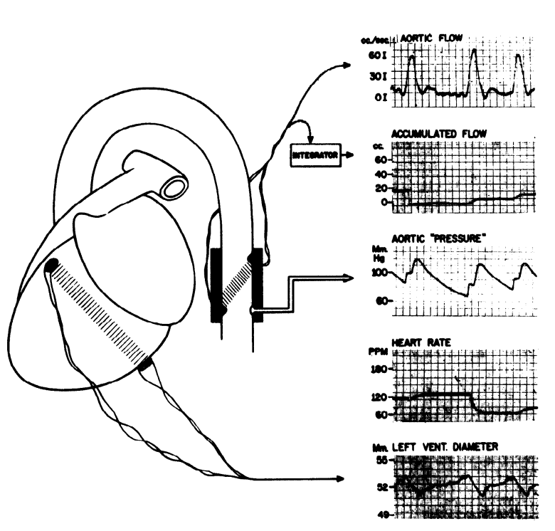 图1 整合通过降主动脉的血流以评估每搏输出量,通过安装在左室两侧的钛酸钡晶体(Barium titanate crystals)间的超声传播时间来记录左心室的直径