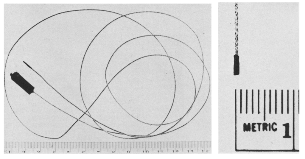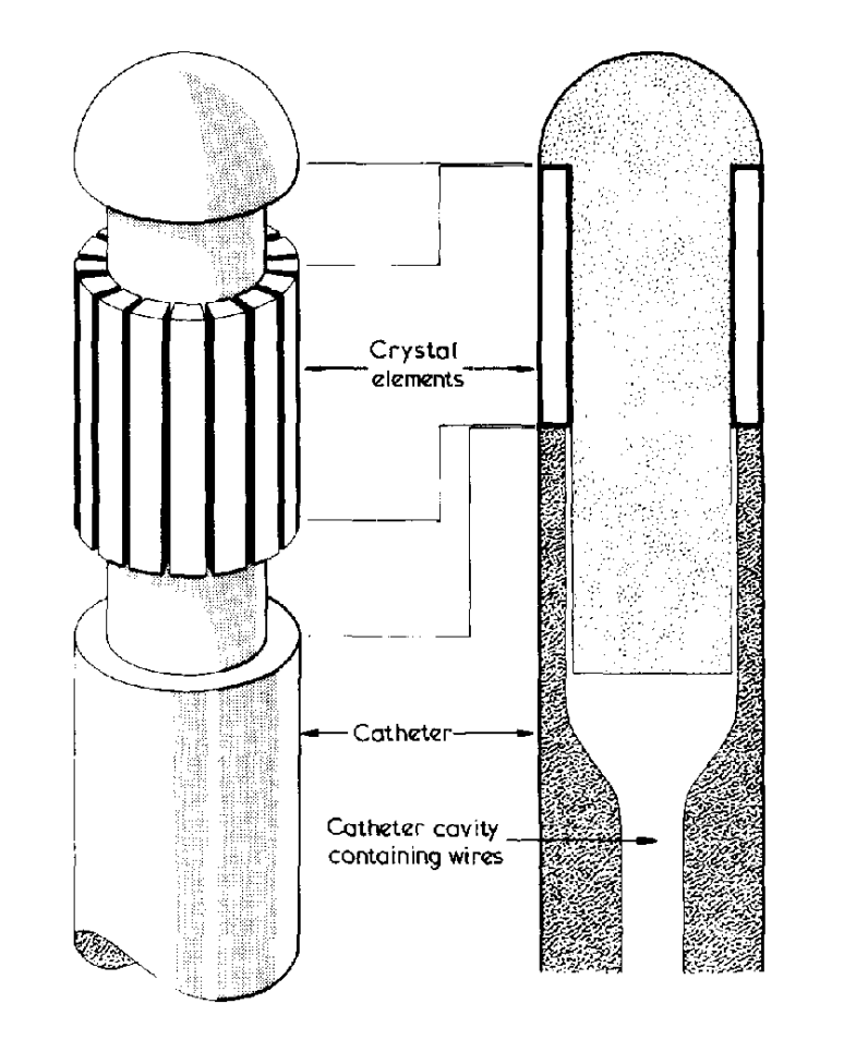 早在1956年,Tomasz Cieszyński教授就制造了第一根超声波导管,拟用于心内检查,但他的第一篇文章仅报告了体外和动物试验的结果。3年后的1959年,University of Washington的Franklin教授团队描述了一种侵入性的超声波测量方法,如下图1,但注意他们开发的超声设备并未进入心内。