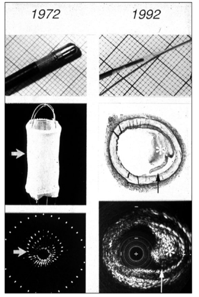 图3 70年代(左,32元件相控阵,5.6MHz)和90年代(右,30MHz)的两代IVUS导管及其成像对比(初代成像好玄幻)