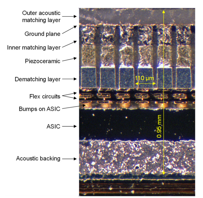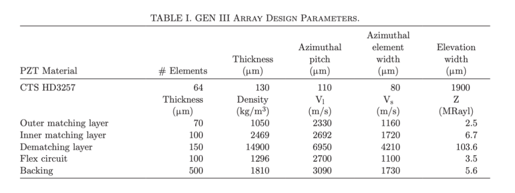 如上图,本次科学家们声学设计的核心是高介电常数压电陶瓷(L-155NF),两个前匹配层(金属填充石墨,以及ABS塑料)耦合PZT,高阻抗“去匹配层dematching layer”(碳化钨)则将PZT从柔性电路和硅ASIC中解耦,并使PZT在四分之一波长模式下运行。高阻抗去匹配层能将大部分声能从压电陶瓷向前引导通过匹配层,从而减少了对高衰减背层的需求。
