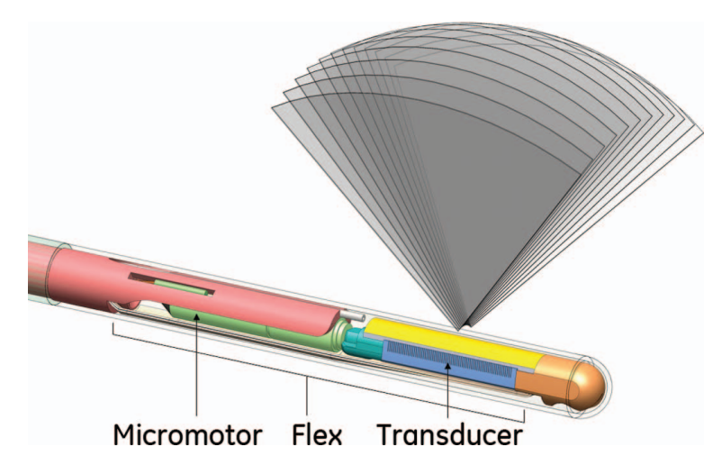 图7 GEN III原型导管头段设计,换能器位于远端而微电机位于近段,柔性互联电路可在其下方空间内旋转