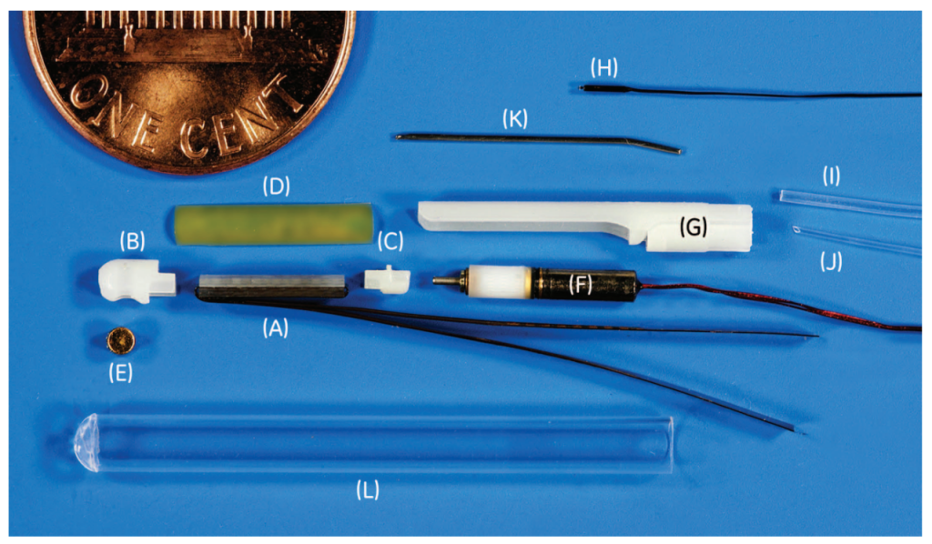 图8 GEN III原型导管头段的分解图。(A)换能器;(B)和(C)远端和近端换能器固定装置;(D)非聚焦透镜;(E)磁铁;(F)电机和变速箱;(G)电机固定装置;(H)热敏电阻;(I)填充管;(J)通气管;(K)填充针。所有换能器和电机组件集成并密封在10-Fr的聚甲基戊烯管(L)内
