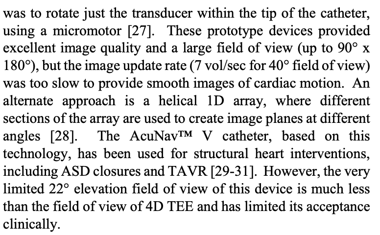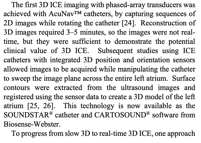 后面有段历史相信大家也很熟悉了,反正不晓得谁离开了谁,BW和另一家联手了,GE的科学家们则在2016年发表了一篇新进展。这次的题目就起得比较实际了“4D ICE:a 2D array transducer with integrated ASIC in a 10 Fr catheter for real-time 3D intracardiac echocardiography”,ASIC-专用集成电路(Application-specific integrated circuits)。此文中的10Fr导管和GE Vivid E9超声成像系统进行联用。我们都晓得,理论上,相控阵换能器只能做一维方向的扫描,如要增加方向,那么就必须增加相控阵元,或加用机械转动,如上文。而在本文中,GE的科学家们特意又提到,当前市面上已有的,连用不同三维标测系统的AcuNAV、ViewFlex和SoundSTAR ICE导管,都是基于一维的相控阵换能器和单平面的二维成像。
