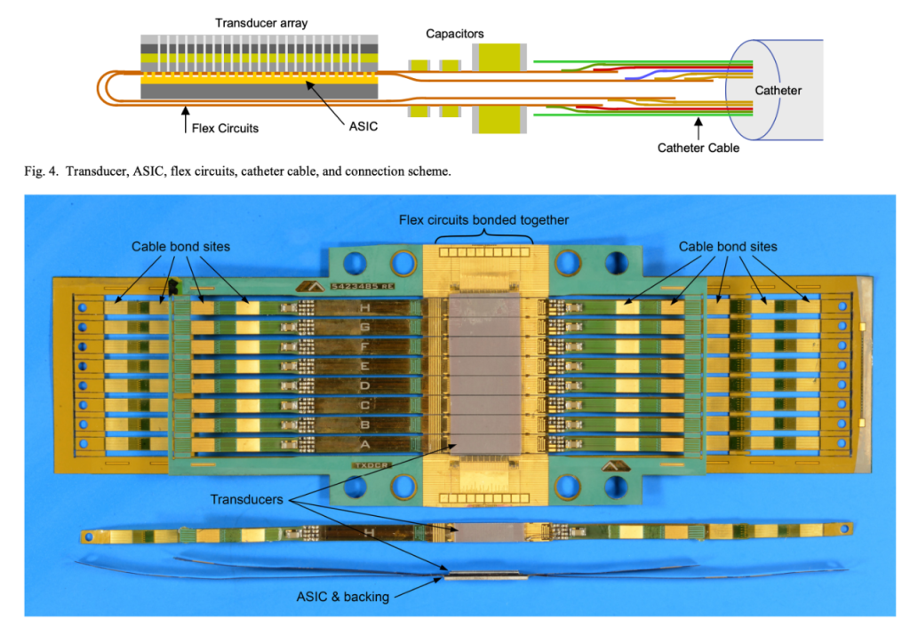 图12 本文中的新换能器和柔性电路设计。两个两层的柔性电路(0.025mm聚酰亚胺)在换能器区域层压在一起,但在其它区域分离以保持灵活性。换能器以8个为一组制造,然后切成小块(底部)以进行最终测试并组装成导管