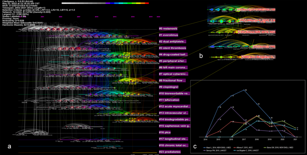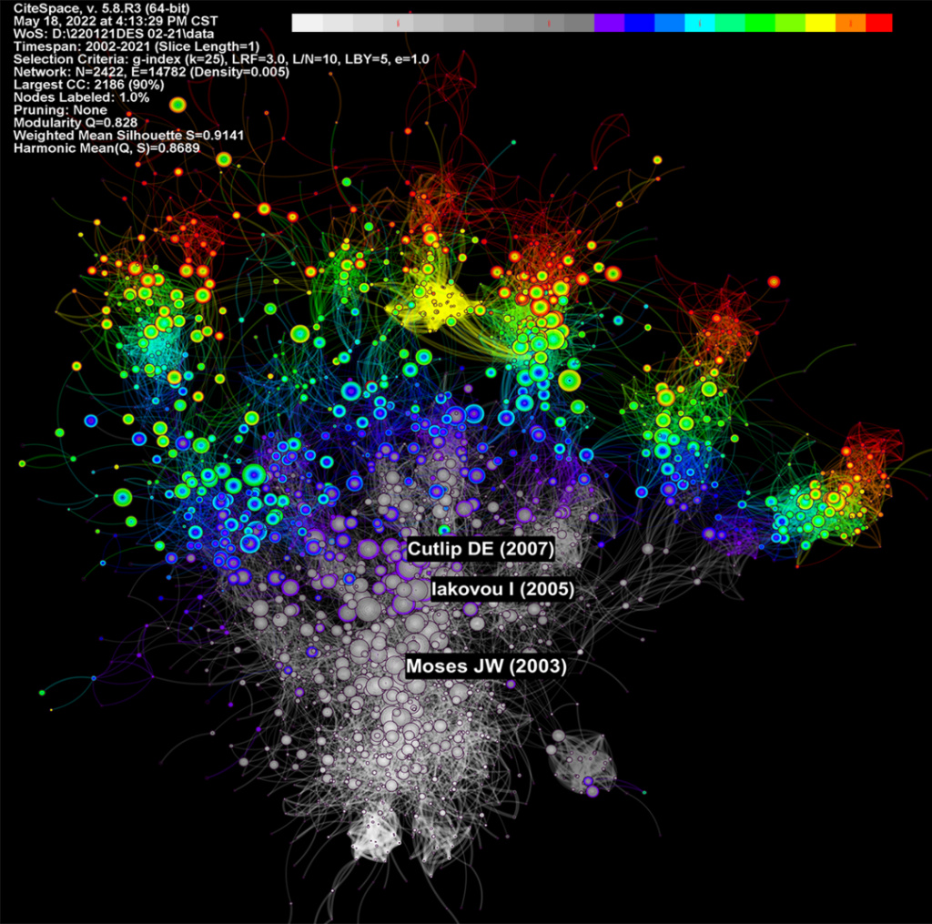 作者分析了20年里(2002-2021)该领域14391篇研究文献的历史特征,包括论文分布情况、科学合作情况等。其中,文献共被引图谱(图1)显示了纳入计量的所有文献之间存在广泛的联系。特别是Mose JW (2003), Iakovou I (2005), 和 Cutlip DE (2007),这三篇文献在该领域占据重要地位,因为它们很高的共现频率和中介中心性。