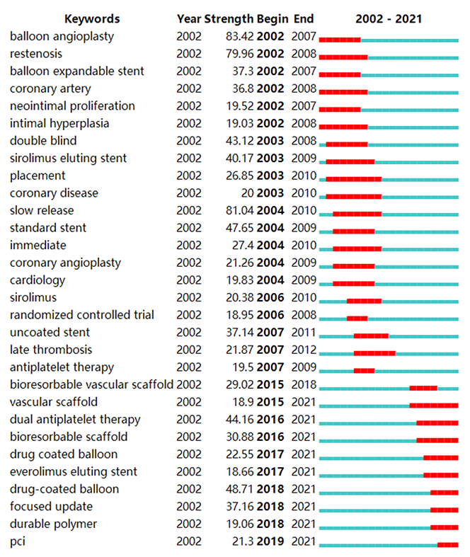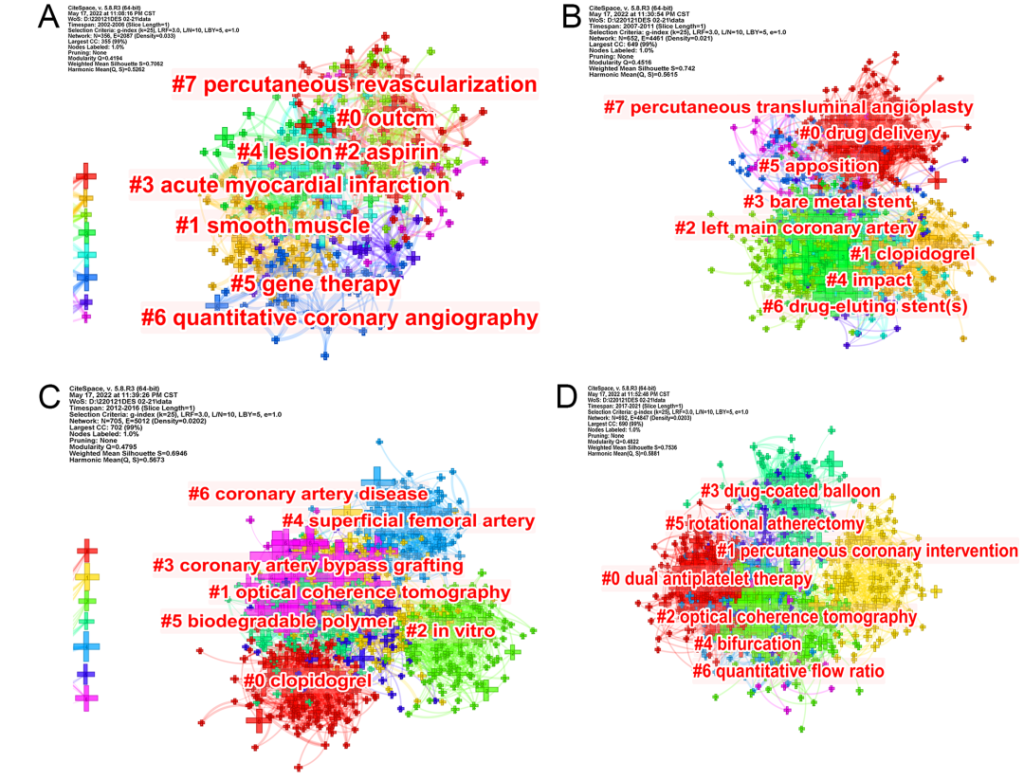 关键词之间存在着密切的内部关联,某些关键词可以根据其亲和度形成不同的聚类,对这些聚类的识别可以更直观地勾勒出DES研究的各个热点子领域。作者将DES发展的20年时间分为4个阶段,每个阶段的关键字聚类快照如图4所示。在第一个快照(2002-2006年)中包含了1238篇论文,产生了8个聚类,如#0 outcm, #1 smooth muscle, 和 #2 aspirin等(图4A);在第二次快照(2007-2011年)中包含了4261篇论文,并生成了8个聚类,如#0 drug delivery, #1 clopidogrel, 和 #2 left main coronary artery等(图4B);在第三个快照(2012-2016年)中包含了4898篇论文,并生成了7个集群,如0# ciopidogrel, #1 optical coherence tomography, 和 #2 in vitro等(图4C);在第四张快照(2017-2021年)中包含了4296篇论文,生成了7个集群,如#0 dual antiplatelet therapy, #1 percutaneous coronary intervention, and #2 optical coherence tomography等(图4D),与过去的15年相比,一些经典的研究,如 #1 percutaneous coronary intervention, 和 #2 optical coherence tomography仍然是热点,而一些新出现的聚类,如#0 dual antiplatelet therapy, #3 drug-coated balloon, #4 bifurcation, 5# rotational atherectomy, 和 6# quantitative flow ratio 获得了更多的关注。