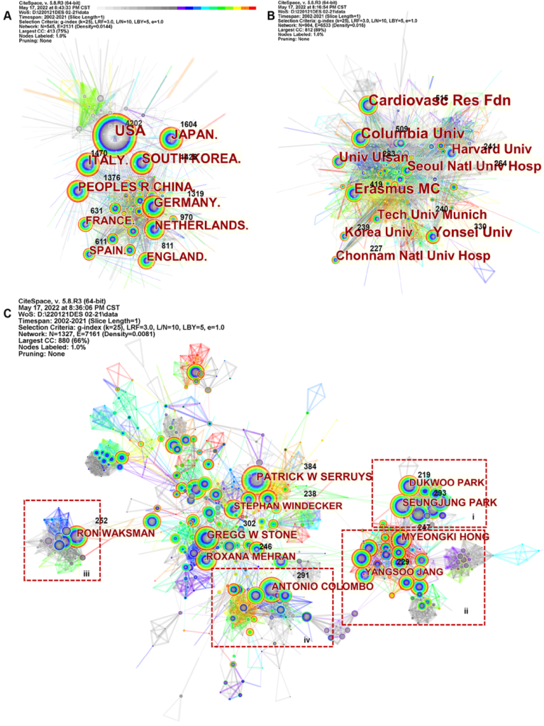 图2所示,大量的节点和丰富的连线表明该领域在国家、机构和作者三个层面都存在紧密的科学协作。国家合作网络(图2A)有545个节点和2131个连线,合作关系前五的国家分别是美国、日本、意大利、韩国、和中国;机构合作网络(图2B)有904个节点和6533条连线,节点大小依次为Cardiovasc Res Fdn, Columbia Univ, Erasmus MC, Yonsei Univ, 和 Univ Ulsan等,表明这五家机构之间的合作关系名列前茅;作者合作网络上有1327个节点和7161条连线(图2C)。PATRICK W SERRUYS, GREGG W STONE, SEUNGJUNG PARK, ANTONIO COLOMBO, 和 RON WAKSMAN领导了该领域的出版物数量,而密集的联系代表了研究人员之间的大量科学合作。