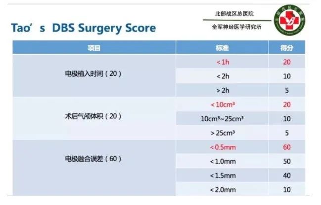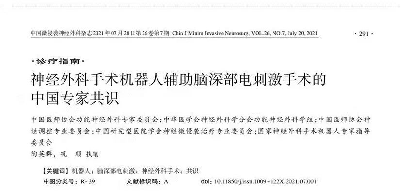 五年内北部战区总医院神经外科机器人DBS手术团队累计完成2500余台机器人手术,包括400余台DBS,800余侧DBS电极植入,在国内外权威期刊发表机器人DBS手术临床论著文章34篇,国际上首次提出并推广《机器人校正注册法》、《陶氏DBS评分法》、《全麻机器人DBS手术》,既提高了DBS手术精准度和安全性,也改善了机器人辅助DBS手术后疗效,为牵头制定专家共识的打下坚实的科研基础。2021年7月,由陶英群教授牵头,来自40余家国内权威神经外科中心的60余位专家参与制定的《神经外科手术机器人辅助脑深部电刺激手术的中国专家共识》正式发布,建立、指导和规范机器人辅助DBS手术的临床实践和推广应用。