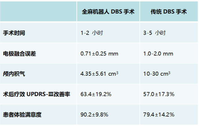 全麻机器人DBS手术比传统手术方式更加安全、精准、微创,使手术时间从传统的平均5小时缩短到2小时以内,患者的体验和疗效更好。