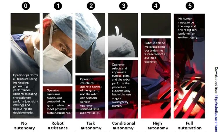 从微创手术、靶向治疗、医院优化到应急响应、假肢和家庭辅助,医疗机器人代表了医疗设备行业增长最快的领域之一。对医疗机器人施加的监管、伦理和法律障碍也需要从不同层面进行仔细考虑。目前国际上,医疗机器人的自动化从0-5被分为了6个级别。目前神经外科DBS手术机器人(ROSA等)发展处于1~2级之间。