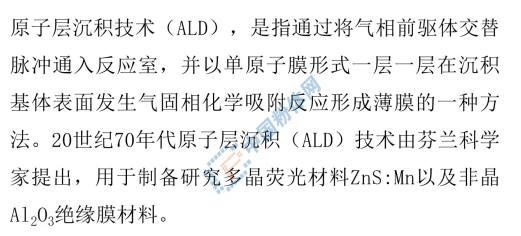 原子层沉积技术(Atomic Layer Deposition,ALD)是一种特殊的化学气相沉积薄膜技术,是通过将气相前驱体交替地通入反应室并在基底表面发生气-固化学反应形成薄膜的一种薄膜方法。