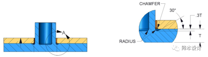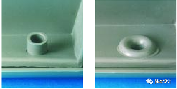 当产品外形有平整度要求、或有其它装配要求时,常常要求热熔后成型铆头不能突出于表面,此时可将被紧固零件对应孔设计成沉孔。