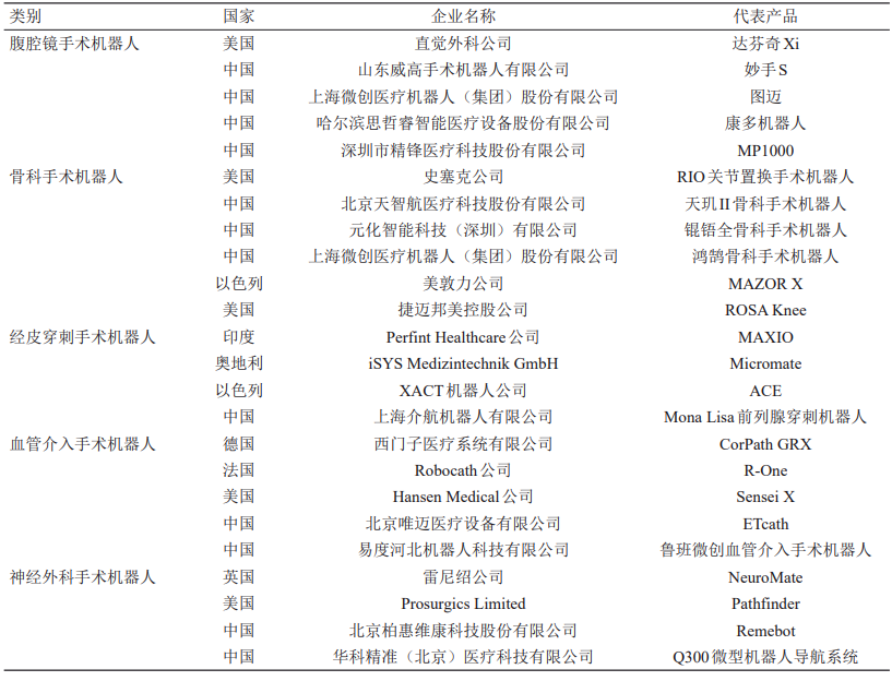 手术机器人可过滤医生手部固有的震颤,降低操作失误的风险,在医生参与的基础上提高精细化水平和手术效果;带有光学导航系统,可指示植入物的放置位置,显著减少X光片的使用数量,有利于减少医生的辐射暴露伤害,在各类放射手术中适应性良好。从临床医学的应用角度看,手术机器人可分为腹腔镜手术机器人、骨科手术机器人、经皮穿刺手术机器人、血管介入手术机器人、神经外科手术机器人、经自然腔道手术机器人等,相关应用现状及代表性企业如表1所示。