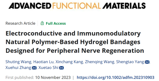 综上所述,神经绷带有效促进神经再生,使神经组织的解剖和功能恢复,同时防止肌肉萎缩。这项工作为周围神经再生提供了一种新策略,并可能在未来具有重要的临床应用。该研究以题为“Electroconductive and Immunomodulatory Natural Polymer-Based Hydrogel Bandages Designed for Peripheral Nerve Regeneration”的论文发表在《Advanced Functional Materials》上。