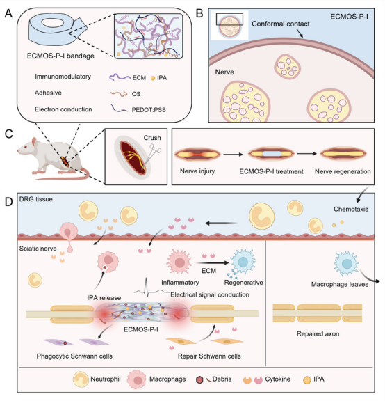 在此,华南理工大学施雪涛/北大口腔张学慧/中日友好医院Shengtao Yang开发了一种用于神经再生的粘性传导免疫调节神经水凝胶绷带。该神经绷带水凝胶由生物活性材料细胞外基质(ECM)、氧化多糖和聚(3,4-乙撑二氧噻吩)/聚(苯乙烯磺酸)(PEDOT:PSS)通过自组装和动态席夫碱交联制备而成。将药物吲哚-3-丙酸 (IPA) 装入神经绷带中,有助于背根神经节中性粒细胞的快速趋化和免疫系统的调节。此外,导电水凝胶绷带与受伤神经具有紧密的保形接触,与电反应神经组织形成稳定且紧密耦合的电桥。