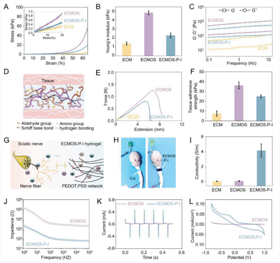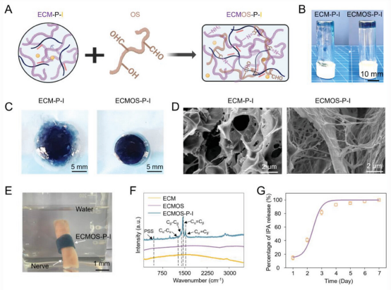 因此,该研究采用一步合成工艺,通过混合ECM、OS、PEDOT:PSS和IPA来生产ECMOS-P-I水凝胶绷带。OS的存在显着改善了机械性能,通过37°C下的动态共价亚胺键合确保形状完整性。ECMOS-P-I水凝胶在水中浸泡24h后仍保持完整,这表明ECMOS-P-I水凝胶作为神经绷带在体内应用的巨大潜力。
