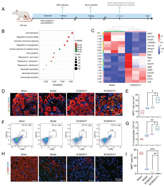 值得注意的是,中性粒细胞配体和中性粒细胞趋化因子在ECMOS-P-I组中选择性上调,表明ECMOS-P-I可能促进中性粒细胞向DRG趋化。与对照组相比,ECMOS-P-I水凝胶绷带治疗增加了DRG组织内的中性粒细胞数量。