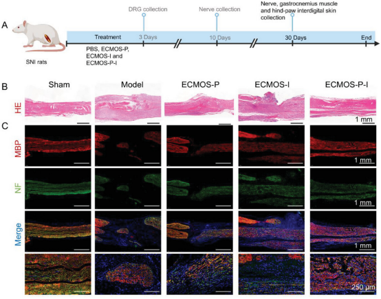 运动功能的恢复与SNI的结构和病理生理学方面密切相关。该研究首先进行了H&E染色,与ECMOS-P和ECMOS-I组相比,ECMOS-P-I组的轴突纤维在损伤部位组织良好且连续。ECMOS-P-水凝胶为轴突再生提供了合适的微环境。对纵向神经切片进行免疫荧光染色,以评估损伤后30天的轴突再生和髓鞘再生,结果证实了ECMOS-P-I水凝胶绷带能够有效促进神经再生。
