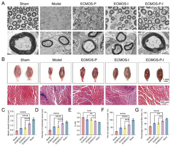 腓肠肌活力可作为SNI后神经再生的重要指标。因此,该研究收获腓肠肌并计算受伤侧和健康侧之间的湿肌肉重量之比。在使用ECMOS-P-I水凝胶绷带后,这种萎缩随着时间的推移逐渐改善,表明神经支配和肌肉恢复。上述结果表明ECMOS-P-I不仅能缓解腓肠肌萎缩,还能恢复肌肉功能和形态。因此,ECMOS-P-I通过及时清除碎片并向神经传递电信号来促进再生神经的髓鞘再生并减轻腓肠肌萎缩。