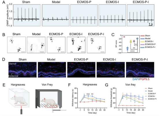 为了验证ECMOS-P-I水凝胶绷带对周围神经再生的促进作用,该研究通过电生理分析评估神经传导,并通过足迹实验评估运动功能恢复。总体而言,该研究表明,ECMOS-P-I神经绷带表现出导电性、免疫调节能力、对湿组织的稳定粘附和促进轴突再生的独特组合。