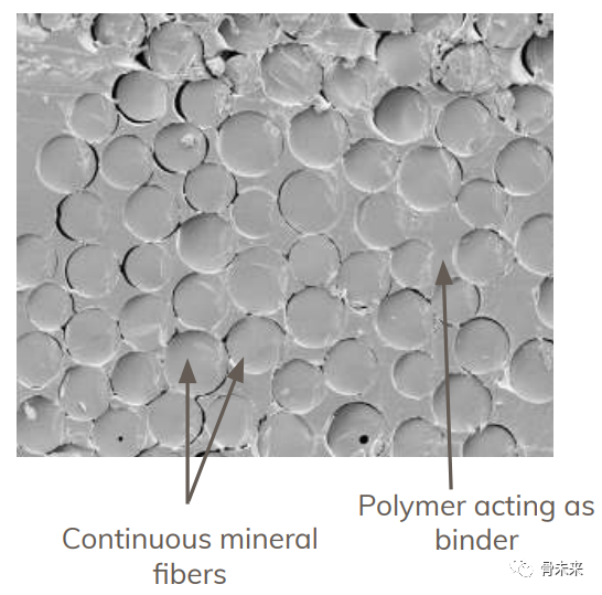 微观结构:这种材料内部有数千个连续的天然矿物纤维,这些纤维被捆扎成束并形成层,悬浮在聚合物树脂中。