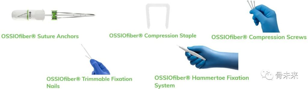公司目前的产品有带线锚钉、加压钉骨针、加压螺钉、可裁剪固定钉、锤状趾畸形固定植入物,这些植入物采用的全是OSSIOfiber®生物整合材料。