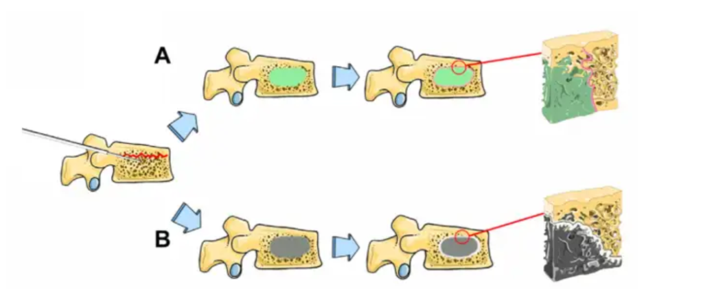 甲基丙烯酸甲酯(MMA)单体是聚甲基丙烯酸甲酯 (PMMA)的基本单位,PMMA预聚物在其中聚合形成大的PMMA分子。PMMA化学稳定性高、成本低、生物力学性能优越,因此是应用最广泛的骨水泥材料。不过,PMMA骨水泥也有潜在的缺点。PMMA的弹性模量与松质骨的弹性模量相差较大,这会导致相邻椎骨再骨折或骨水泥渗漏。此外,有毒的MMA单体会对心血管系统和呼吸系统造成广泛的不利影响。还会引起骨水泥植入综合征。此外,PMMA颗粒缺乏生物活性。PMMA不能降解或与骨有机结合,导致局部炎症、骨水泥松动和植入失败的风险。