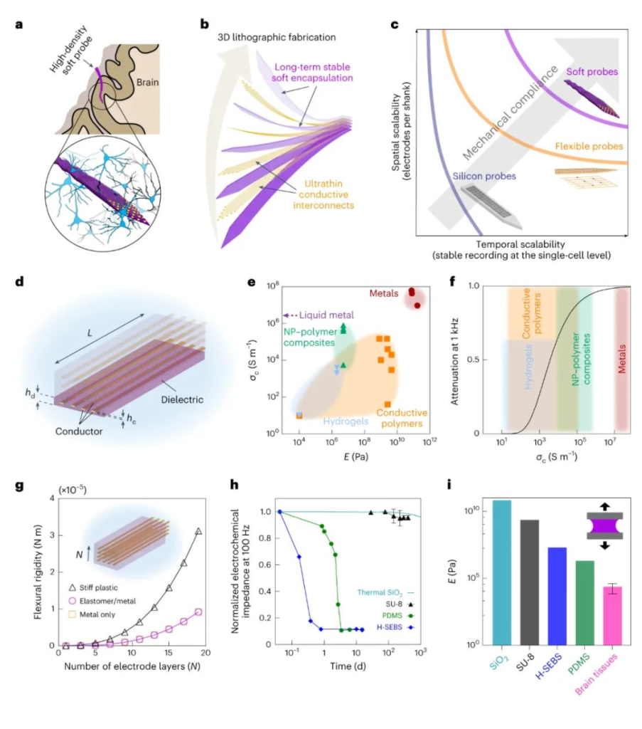然而,实现具有大时空尺度的神经接口仍然具有挑战性:身体对神经探针的免疫反应可能很严重,探针可能会偏离其所需位置,接口电子设备的性能可能会降低。一方面,尽管硅制成的刚性探针可以同时捕捉数百至数千个神经元的活动,但由于异物反应和大脑中的植入漂移,它们的稳定性会随着时间的推移而降低。另一方面,由薄膜塑料制成的柔性探针在几个月内跟踪神经元活动时具有稳定性,但受到设计限制,因为只有刚性材料才能用于纳米制造,因此需要探针非常薄。