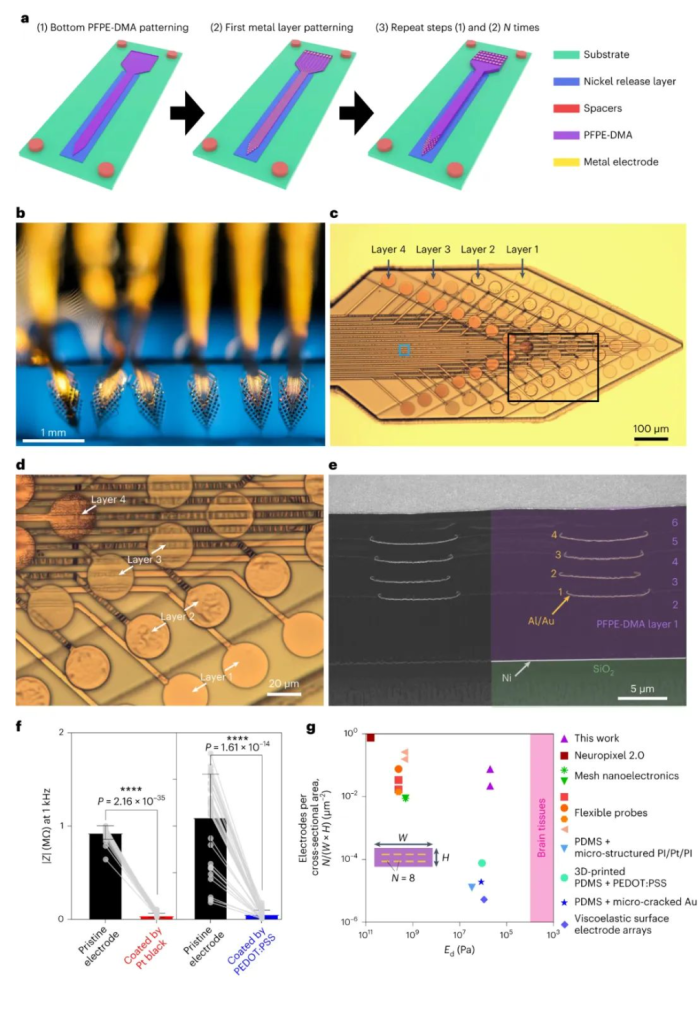 研究人员通过与纳米厚导电电极的垂直堆叠,在高密度、软神经探针的光刻制造中集成了氟化弹性体作为光致抗蚀剂。氟化弹性体的低模量确保了探针的灵活性,即使集成了多个电极层。当软神经探针被植入小鼠皮层时,它们被证明可以有效地记录神经活动。值得注意的是,尽管它们的横向尺寸远大于超柔性探针的横向尺寸,但该探针在几个月内实现了对单个神经元活动的稳定记录。该软神经探针还成功记录了小鼠脊髓的电活动,证明了它们在需要高变形能力的神经界面中的潜力。